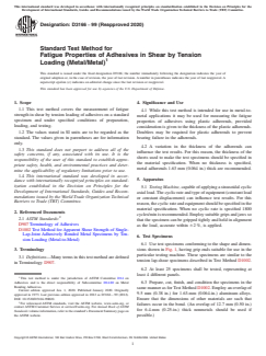 ASTM D3166-99(2020) is a standard published by ASTM International. Its full title is "Standard Test Method for Fatigue Properties of Adhesives in Shear by Tension Loading (Metal/Metal)". This standard covers: SIGNIFICANCE AND USE 4.1 While this test method is intended for use in metal-to-metal applications it may be used for measuring the fatigue properties of adhesives using plastic adherends, provided consideration is given to the thickness of the plastic adherends. Doublers may be required for plastic adherends to prevent bearing failure in the adherends. 4.2 A variation in the thickness of the adherends can influence the test results. For this reason, the thickness of the sheets used to make the test specimens should be specified in the material specification. When no thickness is specified, metal adherends 1.63 mm (0.064 in.) thick are recommended. SCOPE 1.1 This test method covers the measurement of fatigue strength in shear by tension loading of adhesives on a standard specimen and under specified conditions of preparation, loading, and testing. 1.2 The values stated in SI units are to be regarded as the standard. The values given in parentheses are for information only. 1.3 This standard does not purport to address all of the safety concerns, if any, associated with its use. It is the responsibility of the user of this standard to establish appropriate safety, health, and environmental practices and determine the applicability of regulatory limitations prior to use. 1.4 This international standard was developed in accordance with internationally recognized principles on standardization established in the Decision on Principles for the Development of International Standards, Guides and Recommendations issued by the World Trade Organization Technical Barriers to Trade (TBT) Committee.