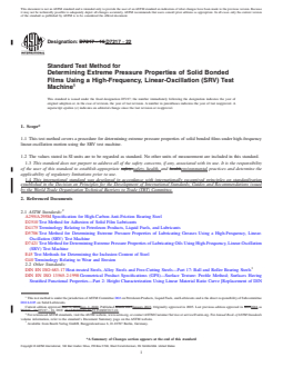 SIGNIFICANCE AND USE 5.1 This laboratory test method can be used to quickly determine extreme pressure properties of parts coated with solid bonded films at selected temperatures specified for use in unlubricated applications where high-speed vibrational or start-stop motions are present with high Hertzian point contact. This test method has found wide application in qualifying solid bonded films used in automotive door lock mechanisms, hinge joints, bolts, and in aerospace. This test method is a material and application oriented approach for characterizing the tribological behaviour using random, discrete and constant parameter combinations. Users of this test method should determine whether results correlate with field performance or other applications. SCOPE 1.1 This test method covers a procedure for determining extreme pressure properties of solid bonded films under high-frequency linear-oscillation motion using the SRV test machine. 1.2 The values stated in SI units are to be regarded as standard. No other units of measurement are included in this standard. 1.3 This standard does not purport to address all of the safety concerns, if any, associated with its use. It is the responsibility of the user of this standard to establish appropriate safety, health, and environmental practices and determine the applicability of regulatory limitations prior to use. 1.4 This international standard was developed in accordance with internationally recognized principles on standardization established in the Decision on Principles for the Development of International Standards, Guides and Recommendations issued by the World Trade Organization Technical Barriers to Trade (TBT) Committee.
