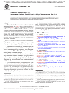 ASTM A106/A106M-19a is a technical specification published by ASTM International. Its full title is "Standard Specification for Seamless Carbon Steel Pipe for High-Temperature Service". This standard covers: ABSTRACT This specification covers carbon steel pipe for high-temperature service. These pipes are suitable for welding, bending, flanging, and similar forming operations. Mechanical testing of the specimens shall include tensile, bending, flattening, hydrostatic and nondestructive electric tests. Specimens undergoing bending tests shall consist of sections cut from a pipe. For flattening tests, the specimens shall be smooth on the ends and burr-free, except when made on crop ends. All tests shall be performed in room temperature. If any test specimen shows flaws it can be discarded and substituted for another test specimen. Before testing, if a specimen has scribe scratches, a retest shall be allowed. A retest shall also be allowed if a specimen breaks in an inside or outside surface flaw. SCOPE 1.1 This specification2 covers seamless carbon steel pipe for high-temperature service (Note 1) in NPS 1/8 to NPS 48 [DN 6 to DN 1200] (Note 2) inclusive, with nominal (average) wall thickness as given in ASME B 36.10M. It shall be permissible to furnish pipe having other dimensions provided such pipe complies with all other requirements of this specification. Pipe ordered under this specification shall be suitable for bending, flanging, and similar forming operations, and for welding. When the steel is to be welded, it is presupposed that a welding procedure suitable to the grade of steel and intended use or service will be utilized. Note 1: It is suggested, consideration be given to possible graphitization. Note 2: The dimensionless designator NPS (nominal pipe size) [DN (diameter nominal)] has been substituted in this standard for such traditional terms as “nominal diameter,” “size,” and “nominal size.” 1.2 Supplementary requirements of an optional nature are provided for seamless pipe intended for use in applications where a superior grade of pipe is required. These supplementary requirements call for additional tests to be made and when desired shall be so stated in the order. 1.3 The values stated in either SI units or inch-pound units are to be regarded separately as standard. The values stated in each system may not be exact equivalents; therefore, each system shall be used independently of the other. Combining values from the two systems may result in non-conformance with the standard. 1.4 The following precautionary caveat pertains only to the test method portion, Sections 11, 12, and 13 of this specification: This standard does not purport to address all of the safety concerns, if any, associated with its use. It is the responsibility of the user of this standard to establish appropriate safety, health, and environmental practices and determine the applicability of regulatory limitations prior to use. 1.5 This international standard was developed in accordance with internationally recognized principles on standardization established in the Decision on Principles for the Development of International Standards, Guides and Recommendations issued by the World Trade Organization Technical Barriers to Trade (TBT) Committee.