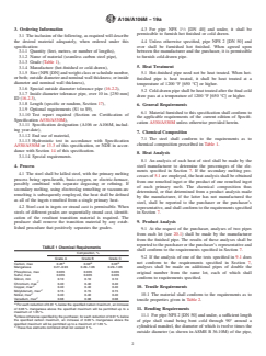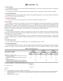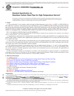ABSTRACT This specification covers carbon steel pipe for high-temperature service. These pipes are suitable for welding, bending, flanging, and similar forming operations. Mechanical testing of the specimens shall include tensile, bending, flattening, hydrostatic and nondestructive electric tests. Specimens undergoing bending tests shall consist of sections cut from a pipe. For flattening tests, the specimens shall be smooth on the ends and burr-free, except when made on crop ends. All tests shall be performed in room temperature. If any test specimen shows flaws it can be discarded and substituted for another test specimen. Before testing, if a specimen has scribe scratches, a retest shall be allowed. A retest shall also be allowed if a specimen breaks in an inside or outside surface flaw. SCOPE 1.1 This specification2 covers seamless carbon steel pipe for high-temperature service (Note 1) in NPS 1/8 to NPS 48 [DN 6 to DN 1200] (Note 2) inclusive, with nominal (average) wall thickness as given in ASME B 36.10M. It shall be permissible to furnish pipe having other dimensions provided such pipe complies with all other requirements of this specification. Pipe ordered under this specification shall be suitable for bending, flanging, and similar forming operations, and for welding. When the steel is to be welded, it is presupposed that a welding procedure suitable to the grade of steel and intended use or service will be utilized. Note 1: It is suggested, consideration be given to possible graphitization. Note 2: The dimensionless designator NPS (nominal pipe size) [DN (diameter nominal)] has been substituted in this standard for such traditional terms as “nominal diameter,” “size,” and “nominal size.” 1.2 Supplementary requirements of an optional nature are provided for seamless pipe intended for use in applications where a superior grade of pipe is required. These supplementary requirements call for additional tests to be made and when desired shall be so stated in the order. 1.3 The values stated in either SI units or inch-pound units are to be regarded separately as standard. The values stated in each system may not be exact equivalents; therefore, each system shall be used independently of the other. Combining values from the two systems may result in non-conformance with the standard. 1.4 The following precautionary caveat pertains only to the test method portion, Sections 11, 12, and 13 of this specification: This standard does not purport to address all of the safety concerns, if any, associated with its use. It is the responsibility of the user of this standard to establish appropriate safety, health, and environmental practices and determine the applicability of regulatory limitations prior to use. 1.5 This international standard was developed in accordance with internationally recognized principles on standardization established in the Decision on Principles for the Development of International Standards, Guides and Recommendations issued by the World Trade Organization Technical Barriers to Trade (TBT) Committee.