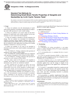 ASTM D7556-10(2019), titled Standard Test Methods for Determining Small-Strain Tensile Properties of Geogrids and Geotextiles by In-Air Cyclic Tension Tests, is an internationally recognized ASTM standard. It provides comprehensive procedures for evaluating the small-strain tensile properties, specifically the cyclic tensile modulus, of geogrids and geotextiles. These test methods are essential for applications involving cyclic loading at small strains, such as in mechanistic-empirical pavement design and reinforced soil structures.