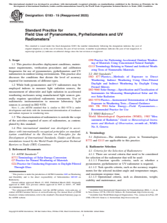 SCOPE 1.1 This practice describes deployment conditions, maintenance requirements, verification procedures and calibration frequencies for use of pyranometers, pyrheliometers and UV radiometers in outdoor testing environments. This practice also discusses the conditions that dictate the level of accuracy required for instruments of different types. 1.2 While both pyranometers and UV radiometers may be employed indoors to measure light radiation sources, the measurement of ultraviolet and light radiation in accelerated weathering enclosures using manufactured light sources generally requires specialized radiometric instruments. Use of radiometric instrumentation to measure laboratory light sources is covered in ISO 9370. Note 1: An ASTM standard that is similar to ISO 9370 is under development and deals with the instrumental determination of irradiance and radiant exposure in weathering tests. 1.3 The characterization of radiometers is outside the scope of the activities required of users of radiometers, as contemplated by this standard. 1.4 This international standard was developed in accordance with internationally recognized principles on standardization established in the Decision on Principles for the Development of International Standards, Guides and Recommendations issued by the World Trade Organization Technical Barriers to Trade (TBT) Committee.
