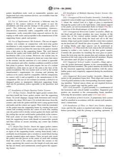 ABSTRACT This specification covers installation procedures for lock-strip gaskets and for infill glazing materials in lock-strip gasket glazing applications used in building walls. The prime performance considerations are weathertightness against air and water infiltration, and structural integrity under wind loads. H-type gasket and reglet-type gasket are types of single-opening gasket systems which should be installed according to the specified requirements. Installation of multiple-opening gasket systems shall be classified as: unsupported vertical ladder assembly; unsupported horizontal ladder assembly; supported vertical ladder assembly; supported horizontal ladder assembly; and grid assembly. Installation of stick system, glass or panel into gasket, and lock-strip shall be in accordance with the requirements specified. SIGNIFICANCE AND USE 3.1 This specification can be referred to in contract documents as a method and workmanship standard for the installation of lock-strip gasket glazing systems. See also related standards (Specifications C542 and C963, Guide C964, and Terminology C717). SCOPE 1.1 This specification covers installation procedures for lock-strip gaskets that comply with Specification C542 and for infill glazing materials in lockstrip gasket glazing applications used in building walls which are not more than 15° from a vertical plane. The prime performance considerations are weathertightness against air and water infiltration, and structural integrity under wind loads. 1.2 The values stated in SI units are to be regarded as standard. The values given in parentheses are provided for information only. 1.3 The committee with jurisdiction over this standard is not aware of any comparable standards published by other organizations. 1.4 This international standard was developed in accordance with internationally recognized principles on standardization established in the Decision on Principles for the Development of International Standards, Guides and Recommendations issued by the World Trade Organization Technical Barriers to Trade (TBT) Committee.
