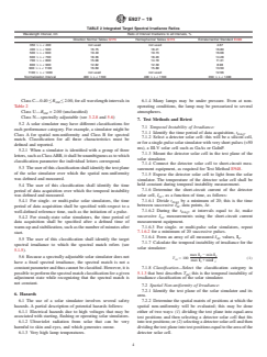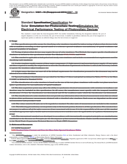 ABSTRACT This specification provides the performance requirements and parameters used for classifying both pulsed and steady state solar simulators intended for indoor testing of photovoltaic devices (solar cells or modules), according to their spectral match to a reference spectral irradiance, non-uniformity of spatial irradiance, and temporal instability of irradiance. The classification of a solar simulator is based on the size of the test plane, and does not provide any information about electrical measurement errors that are related to photovoltaic performance measurements obtained with a classified solar simulator. SCOPE 1.1 This classification provides means for assessing the suitability of solar simulators for indoor electrical performance testing of photovoltaic cells and modules, that is, for measurement current-voltage curves under artificial illumination. 1.2 Solar simulators are classified according to their ability to reproduce a reference spectral irradiance distribution (see Tables G138 and E490), the uniformity of total irradiance across the test plane, and the stability of total irradiance over time. 1.3 A solar simulator usually consists of three major components: (1) light source(s) and associated power supplies; (2) optics and filters required to modify the irradiance at the test plane; and (3) controls to operate the simulator, including irradiance adjustment. 1.4 This classification is applicable to both pulsed and steady-state solar simulators. 1.5 Many solar simulators also include integral data acquisition systems for photovoltaic performance testing; these data acquisition systems are outside of the scope of this classification. 1.6 Light sources for weathering, durability, or conditioning of photovoltaic devices are outside of the scope of this classification. 1.7 This classification is not applicable to solar simulators intended for testing photovoltaic concentrator devices. 1.8 The values stated in SI units are to be regarded as standard. No other units of measurement are included in this standard. 1.9 The following precautionary caveat pertains only to the hazards portion, Section 6, of this classification. This standard does not purport to address all of the safety concerns, if any, associated with its use. It is the responsibility of the user of this standard to establish appropriate safety, health, and environmental practices and determine the applicability of regulatory limitations prior to use. 1.10 This international standard was developed in accordance with internationally recognized principles on standardization established in the Decision on Principles for the Development of International Standards, Guides and Recommendations issued by the World Trade Organization Technical Barriers to Trade (TBT) Committee.