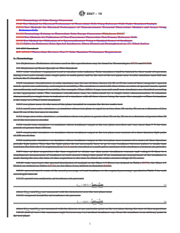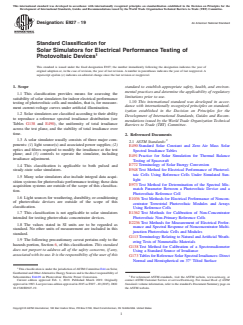 ASTM E927-19 is a standard published by ASTM International. Its full title is "Standard Classification for Solar Simulators for Electrical Performance Testing of Photovoltaic Devices". This standard covers: ABSTRACT This specification provides the performance requirements and parameters used for classifying both pulsed and steady state solar simulators intended for indoor testing of photovoltaic devices (solar cells or modules), according to their spectral match to a reference spectral irradiance, non-uniformity of spatial irradiance, and temporal instability of irradiance. The classification of a solar simulator is based on the size of the test plane, and does not provide any information about electrical measurement errors that are related to photovoltaic performance measurements obtained with a classified solar simulator. SCOPE 1.1 This classification provides means for assessing the suitability of solar simulators for indoor electrical performance testing of photovoltaic cells and modules, that is, for measurement current-voltage curves under artificial illumination. 1.2 Solar simulators are classified according to their ability to reproduce a reference spectral irradiance distribution (see Tables G138 and E490), the uniformity of total irradiance across the test plane, and the stability of total irradiance over time. 1.3 A solar simulator usually consists of three major components: (1) light source(s) and associated power supplies; (2) optics and filters required to modify the irradiance at the test plane; and (3) controls to operate the simulator, including irradiance adjustment. 1.4 This classification is applicable to both pulsed and steady-state solar simulators. 1.5 Many solar simulators also include integral data acquisition systems for photovoltaic performance testing; these data acquisition systems are outside of the scope of this classification. 1.6 Light sources for weathering, durability, or conditioning of photovoltaic devices are outside of the scope of this classification. 1.7 This classification is not applicable to solar simulators intended for testing photovoltaic concentrator devices. 1.8 The values stated in SI units are to be regarded as standard. No other units of measurement are included in this standard. 1.9 The following precautionary caveat pertains only to the hazards portion, Section 6, of this classification. This standard does not purport to address all of the safety concerns, if any, associated with its use. It is the responsibility of the user of this standard to establish appropriate safety, health, and environmental practices and determine the applicability of regulatory limitations prior to use. 1.10 This international standard was developed in accordance with internationally recognized principles on standardization established in the Decision on Principles for the Development of International Standards, Guides and Recommendations issued by the World Trade Organization Technical Barriers to Trade (TBT) Committee.