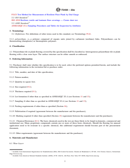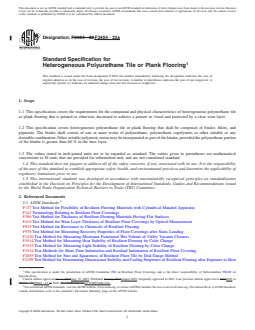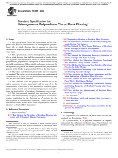 ASTM F3404-23a is a technical specification published by ASTM International. Its full title is "Standard Specification for Heterogeneous Polyurethane Tile or Plank Flooring". This standard covers: SCOPE 1.1 This specification covers the requirements for the compound and physical characteristics of heterogeneous polyurethane tile or plank flooring that is printed or otherwise decorated to achieve a pattern or visual and protected by a clear wear layer. 1.2 This specification covers heterogeneous polyurethane tile or plank flooring that shall be composed of binder, fillers, and pigments. The binder shall consist of one or more resins of polyurethane, polyurethane copolymers or other suitable or any desirable combination. Other suitable polymeric resins may be incorporated as part of the binder, provided the polyurethane portion of the binder is greater than 60 % in the base layer. 1.3 The values stated in inch-pound units are to be regarded as standard. The values given in parentheses are mathematical conversions to SI units that are provided for information only and are not considered standard. 1.4 This standard does not purport to address all of the safety concerns, if any, associated with its use. It is the responsibility of the user of this standard to establish appropriate safety, health, and environmental practices and determine the applicability of regulatory limitations prior to use. 1.5 This international standard was developed in accordance with internationally recognized principles on standardization established in the Decision on Principles for the Development of International Standards, Guides and Recommendations issued by the World Trade Organization Technical Barriers to Trade (TBT) Committee.