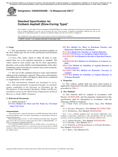 ASTM D2026/D2026M-15(2021)e1 is a technical specification published by ASTM International. Its full title is "Standard Specification for Cutback Asphalt (Slow-Curing Type)". This standard covers: SCOPE 1.1 This specification covers cutback petroleum asphalts of the slow-curing type for use in the construction and treatment of pavements. 1.2 Units—The values stated in either SI units or inch-pound units are to be regarded separately as standard. The values stated in each system may not be exact equivalents; therefore, each system shall be used independently of the other. Combining values from the two systems may result in nonconformance with the standard. 1.3 The text of this standard references notes and footnotes which provide explanatory material. These notes and footnotes (excluding those in tables and figures) shall not be considered as requirements of the standard. 1.4 This international standard was developed in accordance with internationally recognized principles on standardization established in the Decision on Principles for the Development of International Standards, Guides and Recommendations issued by the World Trade Organization Technical Barriers to Trade (TBT) Committee.
