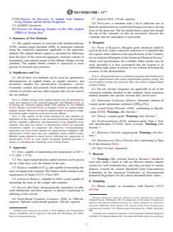 SIGNIFICANCE AND USE 4.1 All of these test methods can be used for quantitative determinations of asphalt binder in asphalt mixtures and pavement samples for specification acceptance, service evaluation, control, and research. Each method prescribes the solvent or solvents and any other reagents that can be used in the test method. Note 2: Further testing of the asphalt mixture may be performed by using sieve analysis on the extracted aggregate, Test Method D5444, or recovering the extracted asphalt binder from solution by Test Method D1856, Practice D5404/D5404M, or Practice D7906 for asphalt binder property testing. When recovering the asphalt binder for property testing, all mineral matter should be removed from the effluent. Note 3: The quality of the results produced by this standard are dependent on the competence of the personnel performing the procedure and the capability, calibration, and maintenance of the equipment used. Agencies that meet the criteria of Specification D3666 are generally considered capable of competent and objective testing/sampling/inspection, etc. Users of this standard are cautioned that compliance with Specification D3666 alone does not completely ensure reliable results. Reliable results depend on many factors; following the suggestions of Specification D3666 or some similar acceptable guideline provides a means of evaluating and controlling some of those factors. SCOPE 1.1 These test methods cover the quantitative determination of asphalt binder content in asphalt mixtures and pavement samples. Aggregate obtained by these methods may be used for sieve analysis using Test Method D5444. This test is not appropriate for testing asphalt mixtures containing coal tar. 1.2 Asphalt binder may be recovered using Test Method D1856, Practice D5404/D5404M, or Practice D7906. 1.3 Units—The values stated in either SI units or inch-pound units are to be regarded separately as standard. The values stated in each system may not be exact equivalents; therefore, each system shall be used independently of the other. Combining values from the two systems may result in nonconformance with the standard. 1.4 The text of this standard references notes and footnotes which provide explanatory material. These notes and footnotes (excluding those in tables and figures) shall not be considered as requirements of the standard. 1.5 This standard does not purport to address all of the safety concerns, if any, associated with its use. It is the responsibility of the user of this standard to establish appropriate safety, health, and environmental practices and determine the applicability of regulatory limitations prior to use. Specific hazards are given in Section 7. Note 1: The results obtained by these test methods may be affected by the age of the material tested, with older samples tending to yield slightly lower asphalt binder content. Best quantitative results are obtained when the test is made on mixtures and pavements shortly after their preparation. It is difficult to remove all the asphalt when some aggregates are used and some chlorides may remain within the mineral matter affecting the measured asphalt content. 1.6 This international standard was developed in accordance with internationally recognized principles on standardization established in the Decision on Principles for the Development of International Standards, Guides and Recommendations issued by the World Trade Organization Technical Barriers to Trade (TBT) Committee.