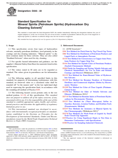 ASTM D235-22: Standard Specification for Mineral Spirits (Petroleum Spirits) (Hydrocarbon Dry Cleaning Solvent) establishes requirements for hydrocarbon solvents commonly known as mineral spirits or Stoddard solvents. These petroleum distillates are mainly used in the coatings and dry-cleaning industries and are classified into different types and classes based on their physical and chemical properties.