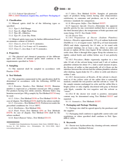 ASTM D235-22 is a technical specification published by ASTM International. Its full title is "Standard Specification for Mineral Spirits (Petroleum Spirits) (Hydrocarbon Dry Cleaning Solvent)". This standard covers: ABSTRACT This specification covers hydrocarbon solvents, normally petroleum distillates, used in coatings and dry-cleaning industries. These solvents are also known as mineral spirits and as Stoddard solvents when used in dry cleaning. The following are the types of mineral spirits: Type I, Type II, Type III, Type IV, Class A, Class B, and Class C. The physical and chemical properties of mineral spirits shall conform to the requirements specified for: aromatic content, commercial reference, appearance, flash point, color, kauri-butanol value, bromine number, odor, doctor test, distillation, residue for distillation, copper corrosion, and apparent specific gravity. These properties shall be tested with the specified test methods. SCOPE 1.1 This specification covers four types of hydrocarbon solvents, normally petroleum distillates, used primarily in the coatings and dry-cleaning industries. “Mineral spirits” is the most common name for these solvents. They are also called “Stoddard Solvents” when used for dry cleaning. 1.2 For specific hazard information and guidance, see the supplier's Material Safety Data Sheet for materials listed in this specification. 1.3 The values stated in SI units are to be regarded as standard. The values given in parentheses are for information only. 1.4 The following applies to all specified limits in this standard; for purposes of determining conformance with this standard, an observed value or a calculated value shall be rounded off “to the nearest unit” in the last right-hand digit used in expressing the specification limit, in accordance with the rounding-off method of Practice E29. 1.5 The following hazard caveat pertains only to the test method portion, 6.1.10, of this specification. This standard does not purport to address all of the safety concerns, if any, associated with its use. It is the responsibility of the user of this standard to establish appropriate safety, health, and environmental practices and determine the applicability of regulatory limitations prior to use. 1.6 This international standard was developed in accordance with internationally recognized principles on standardization established in the Decision on Principles for the Development of International Standards, Guides and Recommendations issued by the World Trade Organization Technical Barriers to Trade (TBT) Committee.