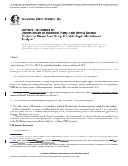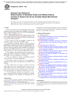 ASTM D8274-20a is a standard published by ASTM International. Its full title is "Standard Test Method for Determination of Biodiesel (Fatty Acid Methyl Esters) Content in Diesel Fuel Oil by Portable Rapid Mid-Infrared Analyzer". This standard covers: SIGNIFICANCE AND USE 5.1 Biodiesel is a fuel commodity primarily used as a blending component with diesel fuel. It is important to check the concentration of biodiesel in the diesel fuel in order to verify it is within limits or does not exceed the maximum allowable limit. 5.2 This test method is applicable for quality control in the production and distribution of diesel fuel and biodiesel blends. 5.3 This test is simple to run, completed in less than one minute, with no dilution of the test sample, no cleaning solvents are required, and the analyzer is portable and self-contained. SCOPE 1.1 This test method covers the determination of the content of biodiesel (fatty acid methyl esters (FAME)) in diesel fuel oils for volume fractions of 0.1 % to 31.0 % by mid-infrared analyzer with a resolution of 0.1 %. Note 1: ASTM and ISO specification fuels falling within the scope of this test method include Specifications: D975 grades No. 1D and No. 2D, D7467, distillate grades of D396, MIL-DTL-16884, and distillate grades of marine fuel specification ISO 8217. 1.2 The accuracy of this test method is based on the molecular weight of C16 and C18 FAME species. 1.2.1 Discussion—Biodiesel contains a variety of species with different molecular weights. Typical market FAMEs from North America and Europe, which are predominantly soy, rapeseed, and used cooking oil derived FAME were included in the pilot study. FAME derived from coconut, which predominantly contains C12, will over-read by approximately 30 %. 1.3 This method cannot distinguish between vegetable oils, animal fats, FAEE, compounds containing carbonyl groups, and FAME. For more information, see Section 6. 1.4 This test method has interim repeatability precision only, see Section 14 for more information. 1.5 The values stated in SI units are to be regarded as standard. No other units of measurement are included in this standard. 1.6 This standard does not purport to address all of the safety concerns, if any, associated with its use. It is the responsibility of the user of this standard to establish appropriate safety, health, and environmental practices and determine the applicability of regulatory limitations prior to use. 1.7 This international standard was developed in accordance with internationally recognized principles on standardization established in the Decision on Principles for the Development of International Standards, Guides and Recommendations issued by the World Trade Organization Technical Barriers to Trade (TBT) Committee.