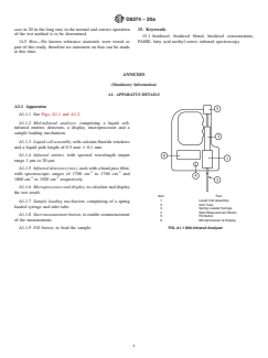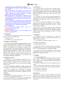 SIGNIFICANCE AND USE 5.1 Biodiesel is a fuel commodity primarily used as a blending component with diesel fuel. It is important to check the concentration of biodiesel in the diesel fuel in order to verify it is within limits or does not exceed the maximum allowable limit. 5.2 This test method is applicable for quality control in the production and distribution of diesel fuel and biodiesel blends. 5.3 This test is simple to run, completed in less than one minute, with no dilution of the test sample, no cleaning solvents are required, and the analyzer is portable and self-contained. SCOPE 1.1 This test method covers the determination of the content of biodiesel (fatty acid methyl esters (FAME)) in diesel fuel oils for volume fractions of 0.1 % to 31.0 % by mid-infrared analyzer with a resolution of 0.1 %. Note 1: ASTM and ISO specification fuels falling within the scope of this test method include Specifications: D975 grades No. 1D and No. 2D, D7467, distillate grades of D396, MIL-DTL-16884, and distillate grades of marine fuel specification ISO 8217. 1.2 The accuracy of this test method is based on the molecular weight of C16 and C18 FAME species. 1.2.1 Discussion—Biodiesel contains a variety of species with different molecular weights. Typical market FAMEs from North America and Europe, which are predominantly soy, rapeseed, and used cooking oil derived FAME were included in the pilot study. FAME derived from coconut, which predominantly contains C12, will over-read by approximately 30 %. 1.3 This method cannot distinguish between vegetable oils, animal fats, FAEE, compounds containing carbonyl groups, and FAME. For more information, see Section 6. 1.4 This test method has interim repeatability precision only, see Section 14 for more information. 1.5 The values stated in SI units are to be regarded as standard. No other units of measurement are included in this standard. 1.6 This standard does not purport to address all of the safety concerns, if any, associated with its use. It is the responsibility of the user of this standard to establish appropriate safety, health, and environmental practices and determine the applicability of regulatory limitations prior to use. 1.7 This international standard was developed in accordance with internationally recognized principles on standardization established in the Decision on Principles for the Development of International Standards, Guides and Recommendations issued by the World Trade Organization Technical Barriers to Trade (TBT) Committee.