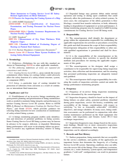 SIGNIFICANCE AND USE 4.1 Establishment of an in-service linings monitoring program permits planning and prioritization of lining maintenance work as needed to maintain lining integrity and performance in nuclear Coating Service Level III systems. Refer to ASTM MNL-8, Manual on Maintenance Coatings for Nuclear Power Plants,7 and Guide D7230, which provides guidance for selecting lining materials for new construction or maintenance of safety-related lining systems. 4.2 A linings monitoring program enables early identification and detection of potential problems in lining systems. Some Coating Service Level III lining systems may be known in advance to be suspect, deficient, or degraded. Monitoring lining performance will assist in developing follow-up procedures to resolve any significant deficiency relative to lining work. 4.3 Degraded linings may generate debris under normal operation and testing or during upset conditions that could adversely affect the performance of safety-related systems. In most cases, the consequence of the debris generation is flow blockage, essential heat transfer reduction, or both; ultimately leading to degradation of equipment or system performance. A linings monitoring program may be required to fulfill licensing commitments for Coating Service Level III lining work. SCOPE 1.1 This guide covers procedures for establishing a program to monitor the performance of Coating Service Level III lining (and coating) systems in operating nuclear power plants. Monitoring is an ongoing process of evaluating the condition of the in-service lining systems. 1.2 Coating Service Level III lining systems subject to this guide are generally those applied to metal substrates comprising raw water, condensate-quality water, or fuel oil wetted (that is, full or intermittent immersion) surfaces in systems that may include: 1.2.1 Service water piping upstream of safety-related components, 1.2.2 Service water pump internals (draft tube, volutes, and diffusers), 1.2.3 Service water heat exchangers including the channels, pass partitions, tubesheets, end bells, and covers 1.2.4 Service water strainers, 1.2.5 Reactor water storage tanks (RWSTs), 1.2.6 Refuel cavity water storage tanks, 1.2.7 Reactor makeup water system, 1.2.8 Component cooling water system, 1.2.9 Lube oil tanks for safety-related equipment, and 1.2.10 Emergency diesel fuel oil system. 1.3 It is the intent of this guide to provide a recommended basis for establishing a linings monitoring program, not to mandate a singular basis for all programs. Variations or simplifications of the program described in this guide may be appropriate for any given operating nuclear power plant depending on its licensing commitments. Similar guidelines may be applicable for certain Coating Service Level II applications such as fluid immersion systems. 1.4 This standard does not purport to address all of the safety concerns, if any, associated with its use. It is the responsibility of the user of this standard to establish appropriate safety, health, and environmental practices and determine the applicability of regulatory limitations prior to use. 1.5 This international standard was developed in accordance with internationally recognized principles on standardization established in the Decision on Principles for the Development of International Standards, Guides and Recommendations issued by the World Trade Organization Technical Barriers to Trade (TBT) Committee.