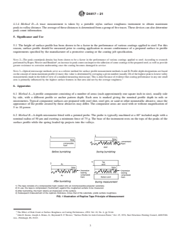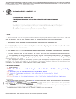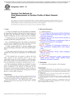 ASTM D4417-21 is a standard published by ASTM International. Its full title is "Standard Test Methods for Field Measurement of Surface Profile of Blast Cleaned Steel". This standard covers: SIGNIFICANCE AND USE 5.1 The height of surface profile has been shown to be a factor in the performance of various coatings applied to steel. For this reason, surface profile should be measured prior to coating application to ensure conformance of a prepared surface to profile requirements specified by the manufacturer of a protective coating or the coating job specification. Note 2: The peak count/peak density has been shown to be a factor in the performance of various coatings applied to steel. According to research performed by Roper, Weaver and Brandon6, an increase in peak count can improve the adhesion of some coatings to the prepared steel, as well as provide greater resistance to corrosion undercutting once the coating becomes damaged in service. Note 3: Optical microscope methods serve as a referee method for surface profile measurement methods A and B. Profile depth designations are based on the concept of mean maximum profile (h max); this value is determined by averaging a given number (usually 20) of the highest peak to lowest valley measurements made in the field of view of a standard measuring microscope. This is done because of evidence that coating performance in any one small area is primarily influenced by the highest surface features in that area and not by the average roughness.7 SCOPE 1.1 These test methods cover the description of techniques for measuring the profile of abrasive blast cleaned surfaces in the field, shop, and laboratory. There are other techniques suitable for laboratory use not covered by these test methods. 1.2 Method B may also be appropriate to the measurement of profile produced by using power tools. Note 1: The Method B procedure in this standard was developed for use on flat surfaces. Depending on the radius of the surface, the results could have greater variability with lower values and averages. 1.3 SSPC standard SSPC-PA 17 provides additional guidance for determining conformance with surface profile requirements. 1.4 The values stated in SI units are to be regarded as the standard. The values given in parentheses are for information only. 1.5 This standard does not purport to address all of the safety concerns, if any, associated with its use. It is the responsibility of the user of this standard to establish appropriate safety, health, and environmental practices and determine the applicability of regulatory limitations prior to use. 1.6 This international standard was developed in accordance with internationally recognized principles on standardization established in the Decision on Principles for the Development of International Standards, Guides and Recommendations issued by the World Trade Organization Technical Barriers to Trade (TBT) Committee.