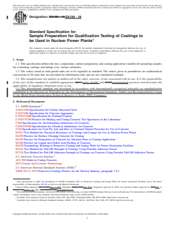ABSTRACT This specification defines the size composition and surface preparation requirements for the preparation of test samples used for qualification testing of coatings utilized in nuclear power plant construction and maintenance. All panels should be carbon steel. Materials shall be tested for abrasion, and shall conform to specified requirements of steel samples, and concrete blocks. SIGNIFICANCE AND USE 4.1 This specification provides uniform requirements for the preparation of test samples used for testing of coatings and linings to be used in nuclear power plants. 4.2 At the users discretion, this standard may also be used when preparing samples to be tested for the purpose of assessing performance attributes for coating and lining systems that may be applied in other types of power plants or for other industrial facilities. 4.3 Users of this guide must ensure that coatings work complies not only with this guide, but also with the licensee’s plant-specific quality assurance program and licensing commitments. SCOPE 1.1 This specification defines the size, composition, surface preparation, and coating application variables for preparing samples for evaluating coatings and linings over various substrates. 1.2 The values stated in inch-pound units are to be regarded as standard. The values given in parentheses are mathematical conversions to SI units that are provided for information only and are not considered standard. 1.3 This standard does not purport to address all of the safety concerns, if any, associated with its use. It is the responsibility of the user of this standard to establish appropriate safety, health, and environmental practices and determine the applicability of regulatory limitations prior to use. 1.4 This international standard was developed in accordance with internationally recognized principles on standardization established in the Decision on Principles for the Development of International Standards, Guides and Recommendations issued by the World Trade Organization Technical Barriers to Trade (TBT) Committee.