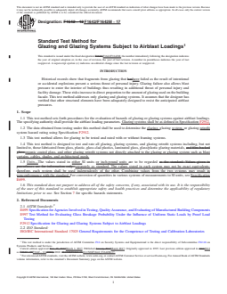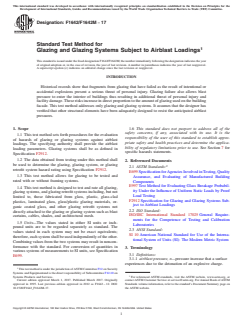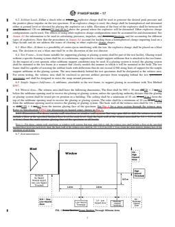 SIGNIFICANCE AND USE 5.1 This test method provides a structured procedure to establish the hazard rating of glazing, glazing systems, and glazing retrofit systems subjected to an airblast loading. Knowing the hazard rating provides the ability to assess the risk of personal injury and facility damage. 5.2 The hazard rating for a glazing or glazing material does not imply that a single specimen will resist the specific airblast for which it is rated with a probability of 1.0. The probability that a single glazing or glazing construction specimen will resist the specific airblast for which it is rated increases proportionally with the number of test specimens that successfully resist the given level of airblast to the hazard level for which it is rated. SCOPE 1.1 This test method sets forth procedures for the evaluation of hazards of glazing or glazing systems against airblast loadings. The specifying authority shall provide the airblast loading parameters. Glazing systems shall be as defined in Specification F2912. 1.2 The data obtained from testing under this method shall be used to determine the glazing, glazing system, or glazing retrofit system hazard rating using Specification F2912. 1.3 This test method allows for glazing to be tested and rated with or without framing systems. 1.4 This test method is designed to test and rate all glazing, glazing systems, and glazing retrofit systems including, but not limited to, those fabricated from glass, plastic, glass-clad plastics, laminated glass, glass/plastic glazing materials, organic coated glass, and other glazing retrofit systems not directly attached to the glazing or glazing system such as blast curtains, cables, shades, and architectural mesh. 1.5 Units—The values stated in either SI units or inch-pound units are to be regarded separately as standard. The values stated in each system may not be exact equivalents; therefore, each system shall be used independently of the other. Combining values from the two systems may result in nonconformance with the standard. For conversion of quantities in various systems of measurements to SI units, see Specification E699. 1.6 This standard does not purport to address all of the safety concerns, if any, associated with its use. It is the responsibility of the user of this standard to establish appropriate safety and health practices and determine the applicability of regulatory limitations prior to use. See Section 7 for specific hazards statements.