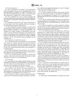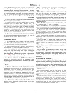 ABSTRACT The purpose of this guide is to provide guidelines for identifying the elements that comprise the test result of a test method and to illustrate how these elements combine into the test result. It covers the types of measurement scales used for expressing observations and test results. This guide provides information on the construction of test results from more elemental measurements. SIGNIFICANCE AND USE 4.1 All test methods have an output in the form of a test result. This guide provides information on the construction of test results from more elemental measurements. 4.2 A well-defined test result is necessary before any precision statements can be made about the test method. 4.2.1 Form and Style for ASTM Standards,2 Section A21, requires that every test method shall contain a statement regarding its precision, preferably as a result of an interlaboratory test program. Reporting of such studies is described in Practice E177, which illustrates the development of test results from observations and test determinations. 4.2.2 Precision statements for ASTM test methods are applicable to test results. They are not applicable to test determinations or observations, unless specifically and clearly indicated otherwise. SCOPE 1.1 This standard provides guidelines for identifying the elements that comprise the test result of a test method and to illustrate how these elements combine into the test result. 1.2 Types of measurement scales used for expressing observations and test results are discussed. 1.3 No system of units is specified in this standard. 1.4 This international standard was developed in accordance with internationally recognized principles on standardization established in the Decision on Principles for the Development of International Standards, Guides and Recommendations issued by the World Trade Organization Technical Barriers to Trade (TBT) Committee.