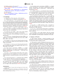 SIGNIFICANCE AND USE 5.1 Polyethylene piping has been used instead of steel alloys in the petrochemical, power, water, gas distribution, and mining industries due to its resistance to corrosion, erosion, and reliability. Recently, polyethylene pipe has also been used for nuclear safety related cooling water applications. SCOPE 1.1 This practice covers microwave (MW) examination of butt fusion joints made entirely of polyethylene for the purpose of joining polyethylene piping or vessel parts. Note 1: The notes in this practice are for information only and shall not be considered part of this practice. Note 2: This practice references HDPE and MDPE for pipe applications as defined by Specification D3350. 1.2 MW examination detects differences between the dielectric constant(s) of the materials being examined. These differences may be due to material construction (expected) or flaws such as voids, cracks, or foreign material intrusion (unexpected). 1.3 The butt fusion joining process can be subject to a variety of flaws including, but not limited to, lack of fusion, particulate contamination, inclusions, and voids. 1.4 This practice is intended for use on polyethylene butt fusion joints of pipe diameters of 4 in. to 65 in. (100 mm – 1650 mm) and wall thickness of 0.5 in. to 4 in. (12 mm – 100 mm). Greater and lesser thicknesses and smaller diameters may be tested using this standard practice if the technique can be demonstrated to provide adequate detection on mockups of the same wall thickness and geometry. 1.5 This standard practice does not address microwave examination of electrofusion joints, socket joints, or saddles. 1.6 This standard details inspection requirement only. Accept/reject criteria must be established contractually and is typically done using multiple samples with mechanical test (that is, tensile test) validation. 1.7 The values stated in inch-pound units are to be regarded as standard. The values given in parentheses are mathematical conversions to SI units that are provided for information only and are not considered standard. 1.8 This standard does not purport to address all of the safety concerns, if any, associated with its use. It is the responsibility of the user of this standard to establish appropriate safety, health, and environmental practices and determine the applicability of regulatory limitations prior to use. 1.9 This international standard was developed in accordance with internationally recognized principles on standardization established in the Decision on Principles for the Development of International Standards, Guides and Recommendations issued by the World Trade Organization Technical Barriers to Trade (TBT) Committee.
