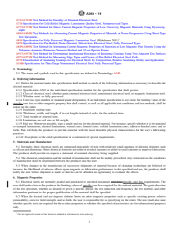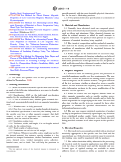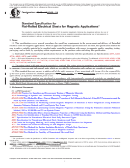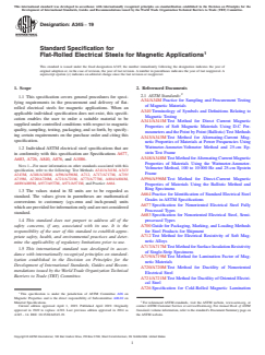 ABSTRACT This specification concerns general procedures for specifying requirements of flat-rolled electrical steels for magnetic applications. This specification is to be used when the material in question is not covered by an ASTM material specification. The specification does not contain requirements but instead lists physical properties, ordering information and other attributes that should be considered when purchasing the material. All ASTM electrical steel specifications are in conformity to this specification. SCOPE 1.1 This specification covers general procedures for specifying requirements in the procurement and delivery of flat-rolled electrical steels for magnetic applications. When an applicable individual specification does not exist, this specification enables the user to order a suitable material to be supplied under controlled conditions with respect to magnetic quality, sampling, testing, packaging, and so forth, by specifying certain requirements on the purchase order and citing this specification. 1.2 Individual ASTM electrical steel specifications that are in conformity with this specification are Specifications A677, A683, A726, A840, A876, and A1086. Note 1: For more information on other standards associated with this specification, refer to the following: Test Methods A341/A341M, A343/A343M, A348/A348M, A596/A596M, A712, A717/A717M, A719/A719M, A720/A720M, A721/A721M, A773/A773M, A804/A804M, A889/A889M, A937/A937M, A971/A971M, and Practice A664. 1.3 The values stated in SI units are to be regarded as standard. The values given in parentheses are mathematical conversions to customary (cgs-emu and inch-pound) units which are provided for information only and are not considered standard. 1.4 This standard does not purport to address all of the safety concerns, if any, associated with its use. It is the responsibility of the user of this standard to establish appropriate safety, health, and environmental practices and determine the applicability of regulatory limitations prior to use. 1.5 This international standard was developed in accordance with internationally recognized principles on standardization established in the Decision on Principles for the Development of International Standards, Guides and Recommendations issued by the World Trade Organization Technical Barriers to Trade (TBT) Committee.