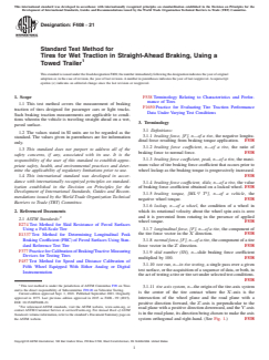 ASTM F408-21 is a standard published by ASTM International. Its full title is "Standard Test Method for Tires for Wet Traction in Straight-Ahead Braking, Using a Towed Trailer". This standard covers: SIGNIFICANCE AND USE 5.1 The measured values are traction properties of tires obtained with the towed trailer described here on a given road surface, under given environmental conditions (ambient and road surface temperature, humidity, wind speed and direction, purity and film depth of water used to wet the road surface). They are carried out in accordance with the stated test procedures and reflect the performance of the total tire-vehicle environmental system. A change in any of these factors may change the measurements on a subsequent run of the test. 5.2 These test methods are suitable for research and development purposes, where tires are compared during a single series of tests. They may not be suitable for regulatory statutes or specification acceptance, because the values obtained may not necessarily agree or correlate either in rank order or absolute traction performance level with those obtained on other road surfaces (or the same surface after additional wear), under other environmental conditions, or other towed trailers, or other test devices, or with results obtained with other test procedures. SCOPE 1.1 This test method covers the measurement of braking traction of tires designed for passenger cars or light trucks. Such braking traction measurements are applicable to conditions wherein the vehicle is traveling straight ahead on a wet, paved surface. 1.2 The values stated in SI units are to be regarded as the standard. The values given in parentheses are for information only. 1.3 This standard does not purport to address all of the safety concerns, if any, associated with its use. It is the responsibility of the user of this standard to establish appropriate safety, health, and environmental practices and determine the applicability of regulatory limitations prior to use. 1.4 This international standard was developed in accordance with internationally recognized principles on standardization established in the Decision on Principles for the Development of International Standards, Guides and Recommendations issued by the World Trade Organization Technical Barriers to Trade (TBT) Committee.