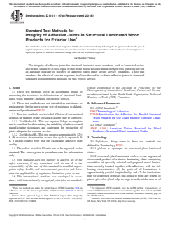ASTM D1101-97a(2018), titled Standard Test Methods for Integrity of Adhesive Joints in Structural Laminated Wood Products for Exterior Use, is an international standard developed by ASTM International. This standard establishes accelerated laboratory test methods to evaluate the resistance of adhesive joints in structural laminated wood members-such as glulam beams and arches-specifically intended for exterior environments. Reliable adhesive joints are essential to the structural integrity and long-term performance of engineered wood products exposed to moisture and climate variations.