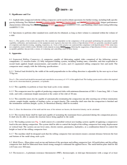 SIGNIFICANCE AND USE 5.1 Asphalt slabs compacted with the rolling compactor can be used to obtain specimens for further testing, including bulk specific gravity following Test Methods D1188/D1188M, D2726/D2726M, and D6752/D6752M, fatigue performance characteristics following Test Methods D7460 and D8237 or AASHTO T 321, and Hamburg wheel-track testing following AASHTO T 324. 5.2 Specimens to perform other standard tests could also be obtained, as long as their volume is contained within the volume of a slab. Note 1: The quality of the results produced by this standard are dependent on the competence of the personnel performing the procedure and the capability, calibration, and maintenance of the equipment used. Agencies that meet the criteria of Specification D3666 are generally considered capable of competent and objective testing, sampling, inspection, etc. Users of this practice are cautioned that compliance with Specification D3666 alone does not completely ensure reliable results. Reliable results depend on many factors; following the suggestions of Specification D3666 or some similar acceptable guideline that provides a means of evaluating and controlling some of those factors. SCOPE 1.1 This practice covers the fabrication of slabs of asphalt mix using an automated laboratory rolling compactor (RC). Compacted specimens are suitable for volumetric and physical property testing. This practice should not be used for acceptance or rejection of a material or for purchasing purposes. 1.2 Units—The values stated in SI units are to be regarded as standard. No other units of measurement are included in this standard. 1.3 The text of this standard references notes and footnotes which provide explanatory material. These notes and footnotes (excluding those in tables and figures) shall not be considered as requirements of the standard. 1.4 This standard does not purport to address all of the safety concerns, if any, associated with its use. It is the responsibility of the user of this standard to establish appropriate safety, health, and environmental practices and determine the applicability of regulatory limitations prior to use. 1.5 This international standard was developed in accordance with internationally recognized principles on standardization established in the Decision on Principles for the Development of International Standards, Guides and Recommendations issued by the World Trade Organization Technical Barriers to Trade (TBT) Committee.