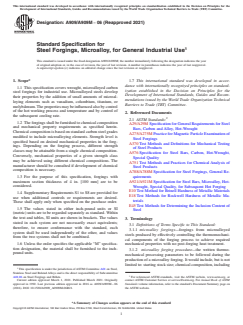 ASTM A909/A909M-06(2021) is the standard specification developed by ASTM International for steel forgings, microalloy, intended for general industrial use. This standard covers forged, microalloyed carbon steel products, focusing on the enhancement of mechanical properties through the addition of small amounts of microalloying elements such as vanadium, columbium (niobium), titanium, or molybdenum. The specification ensures consistency and reliability for industrial applications, combining precise chemical composition and rigorous mechanical property requirements.