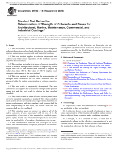 ASTM D8163-18(2023) is a standard published by ASTM International. Its full title is "Standard Test Method for Determination of Strength of Colorants and Bases for Architectural, Marine, Maintenance, Commercial, and Industrial Coatings". This standard covers: SIGNIFICANCE AND USE 5.1 The test method results are suitable for use by manufacturers of colorants and bases for quality control purposes on manufactured product. 5.2 The test method results are suitable for use by purchasers of colorants and bases for incoming quality control or the determination of money value of colorants and bases. SCOPE 1.1 This test method covers the determination of strength of colorant dispersions, colored and white bases, for architectural, marine, maintenance, commercial, and industrial coatings. 1.2 This test method applies to colorant dispersions and colored and white bases regardless of the methods used to disperse these materials. 1.3 The resultant test value is in terms of percent strength in which a material stronger than standard is implied by values larger than 100 % and weaker than standard is implied by values less than 100 %. The value of 100 % implies exact strength conformance to the test method. 1.4 This test method is suitable for the determination of strength when tolerances are set about standards that are prepared either by weight concentration or volume concentration. 1.5 The test result is empirically determined. The user determines and supplies the standard for strength of the product under test and the test result is relative to that supplied standard. 1.6 The values stated in either SI units or inch-pound units are to be regarded separately as standard. The values stated in each system are not necessarily exact equivalents; therefore, to ensure conformance with the standard, each system shall be used independently of the other, and values from the two systems shall not be combined. 1.7 This standard does not purport to address all of the safety concerns, if any, associated with its use. It is the responsibility of the user of this standard to establish appropriate safety, health, and environmental practices and determine the applicability of regulatory limitations prior to use. 1.8 This international standard was developed in accordance with internationally recognized principles on standardization established in the Decision on Principles for the Development of International Standards, Guides and Recommendations issued by the World Trade Organization Technical Barriers to Trade (TBT) Committee.