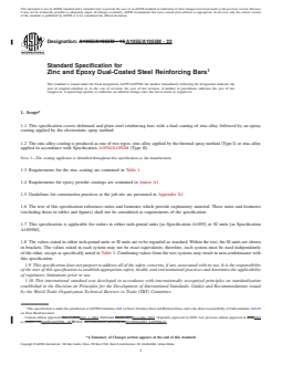 ABSTRACT This specification covers deformed and plain steel reinforcing bars with a dual coating of zinc alloy and an epoxy coating. The zinc alloy layer shall be applied by the thermal spray coating method followed by an epoxy coating, which shall be applied by the electrostatic spray method. The zinc coating shall conform to the required chemical composition for aluminum, cadmium, copper, iron, lead, tin, antimony, silver, bismuth, arsenic, nickel, magnesium, titanium, and zinc. The coated steel reinforcing bars shall conform to bend test requirements and to physical properties such as coating thickness, coating continuity, epoxy coating flexibility, and coating adhesion. SCOPE 1.1 This specification covers deformed and plain steel reinforcing bars with a dual coating of zinc-alloy followed by an epoxy coating applied by the electrostatic spray method. 1.2 The zinc-alloy coating is produced as one of two types: zinc-alloy applied by the thermal spray method (Type I) or zinc-alloy applied in accordance with Specification A1094/A1094M (Type II). Note 1: The coating applicator is identified throughout this specification as the manufacturer. 1.3 Requirements for the zinc coating are contained in Table 1. 1.4 Requirements for epoxy powder coatings are contained in Annex A1. 1.5 Guidelines for construction practices at the job-site are presented in Appendix X1. 1.6 The text of this specification references notes and footnotes which provide explanatory material. These notes and footnotes (excluding those in tables and figures) shall not be considered as requirements of the specification. 1.7 This specification is applicable for orders in either inch-pound units [as Specification A1055] or SI units [as Specification A1055M]. 1.8 The values stated in either inch-pound units or SI units are to be regarded as standard. Within the text, the SI units are shown in brackets. The values stated in each system may not be exact equivalents; therefore, each system must be used independently of the other, except as specifically noted in Table 2. Combining values from the two systems may result in non-conformance with this specification. 1.9 This specification does not purport to address all of the safety concerns, if any, associated with its use. It is the responsibility of the user of this specification to establish appropriate safety, health, and environmental practices and determine the applicability of regulatory limitations prior to use. 1.10 This international standard was developed in accordance with internationally recognized principles on standardization established in the Decision on Principles for the Development of International Standards, Guides and Recommendations issued by the World Trade Organization Technical Barriers to Trade (TBT) Committee.