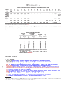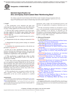 ASTM A1055/A1055M-22 is a technical specification published by ASTM International. Its full title is "Standard Specification for Zinc and Epoxy Dual-Coated Steel Reinforcing Bars". This standard covers: ABSTRACT This specification covers deformed and plain steel reinforcing bars with a dual coating of zinc alloy and an epoxy coating. The zinc alloy layer shall be applied by the thermal spray coating method followed by an epoxy coating, which shall be applied by the electrostatic spray method. The zinc coating shall conform to the required chemical composition for aluminum, cadmium, copper, iron, lead, tin, antimony, silver, bismuth, arsenic, nickel, magnesium, titanium, and zinc. The coated steel reinforcing bars shall conform to bend test requirements and to physical properties such as coating thickness, coating continuity, epoxy coating flexibility, and coating adhesion. SCOPE 1.1 This specification covers deformed and plain steel reinforcing bars with a dual coating of zinc-alloy followed by an epoxy coating applied by the electrostatic spray method. 1.2 The zinc-alloy coating is produced as one of two types: zinc-alloy applied by the thermal spray method (Type I) or zinc-alloy applied in accordance with Specification A1094/A1094M (Type II). Note 1: The coating applicator is identified throughout this specification as the manufacturer. 1.3 Requirements for the zinc coating are contained in Table 1. 1.4 Requirements for epoxy powder coatings are contained in Annex A1. 1.5 Guidelines for construction practices at the job-site are presented in Appendix X1. 1.6 The text of this specification references notes and footnotes which provide explanatory material. These notes and footnotes (excluding those in tables and figures) shall not be considered as requirements of the specification. 1.7 This specification is applicable for orders in either inch-pound units [as Specification A1055] or SI units [as Specification A1055M]. 1.8 The values stated in either inch-pound units or SI units are to be regarded as standard. Within the text, the SI units are shown in brackets. The values stated in each system may not be exact equivalents; therefore, each system must be used independently of the other, except as specifically noted in Table 2. Combining values from the two systems may result in non-conformance with this specification. 1.9 This specification does not purport to address all of the safety concerns, if any, associated with its use. It is the responsibility of the user of this specification to establish appropriate safety, health, and environmental practices and determine the applicability of regulatory limitations prior to use. 1.10 This international standard was developed in accordance with internationally recognized principles on standardization established in the Decision on Principles for the Development of International Standards, Guides and Recommendations issued by the World Trade Organization Technical Barriers to Trade (TBT) Committee.