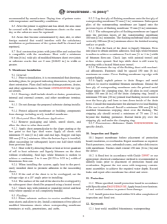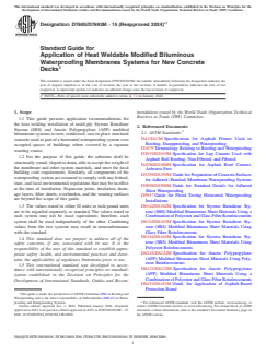 ASTM D7693/D7693M-15(2024)e1 is a guide published by ASTM International. Its full title is "Standard Guide for Application of Heat Weldable Modified Bituminous Waterproofing Membranes Systems for New Concrete Decks". This standard covers: SIGNIFICANCE AND USE 4.1 This guide provides general procedures, information, guidelines, and precautions for the application of heat welded modified bituminous waterproofing systems used as part of a horizontal waterproofing system. 4.2 This guide is not all-inclusive and is intended only to supplement detailed instructions from designers and system manufacturers. 4.3 The horizontal deck or substrate referred to in this guide is reinforced cast-in-place structural concrete. SCOPE 1.1 This guide presents application recommendations for the heat welding installation of multi-ply Styrene Butadiene Styrene (SBS) and Atactic Polypropylene (APP) modified bituminous systems to new, reinforced, cast-in-place structural concrete used as part of a horizontal waterproofing system over occupied spaces of buildings where covered by a separate wearing course. 1.2 For the purpose of this guide, the substrate shall be structurally sound, sloped to drain, able to accept the weight of the membrane and other system materials, and meet the local building code requirements. Similarly, all components of the waterproofing system are assumed to comply with any federal, state, and local environmental regulations that may be in effect at the time of installation. Expansion joints, insulation, drainage layers, filter sheets, overburden, and the wearing surfaces are beyond the scope of this guide. 1.3 The values stated in either SI units or inch-pound units are to be regarded separately as standard. The values stated in each system may not be exact equivalents; therefore, each system shall be used independently of the other. Combining values from the two systems may result in nonconformance with the standard. 1.4 This standard does not purport to address all of the safety concerns, if any, associated with its use. It is the responsibility of the user of this standard to establish appropriate safety, health, and environmental practices and determine the applicability of regulatory limitations prior to use. 1.5 This international standard was developed in accordance with internationally recognized principles on standardization established in the Decision on Principles for the Development of International Standards, Guides and Recommendations issued by the World Trade Organization Technical Barriers to Trade (TBT) Committee.