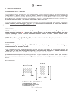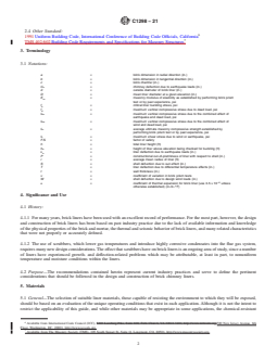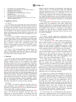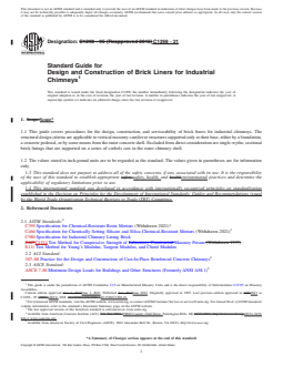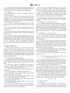 SIGNIFICANCE AND USE 4.1 History: 4.1.1 For many years, brick liners have been used with an excellent record of performance. For the most part, however, the design and construction of brick liners has been based on past industry practice due to the lack of available information and knowledge of the physical properties of the brick and mortar, the thermal and seismic behavior of brick liners, and many related characteristics that were not properly or accurately defined. 4.1.2 The use of scrubbers, which lower gas temperatures and introduce highly corrosive condensates into the flue gas system, requires many new design considerations. The effect that scrubbers have on brick liners is an ongoing area of study, since a number of liners have experienced growth- and deflection-related problems which may be attributable, at least in part, to nonuniform temperature and moisture conditions within the liners. 4.2 Purpose—The recommendations contained herein represent current industry practices and serve to define the pertinent considerations that should be followed in the design and construction of brick chimney liners. SCOPE 1.1 This guide covers procedures for the design, construction, and serviceability of brick liners for industrial chimneys. The structural design criteria are applicable to vertical masonry cantilever structures supported only at their base, either by a foundation, a concrete pedestal, or by some means from the outer concrete shell. Excluded from direct consideration are single-wythe, sectional brick linings that are supported on a series of corbels cast in the outer chimney shell. 1.2 The values stated in inch-pound units are to be regarded as the standard. The values given in parentheses are for information only. 1.3 This standard does not purport to address all of the safety concerns, if any, associated with its use. It is the responsibility of the user of this standard to establish appropriate safety, health, and environmental practices and determine the applicability of regulatory limitations prior to use. 1.4 This international standard was developed in accordance with internationally recognized principles on standardization established in the Decision on Principles for the Development of International Standards, Guides and Recommendations issued by the World Trade Organization Technical Barriers to Trade (TBT) Committee.