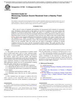 ASTM E1780-12(2021) is a guide published by ASTM International. Its full title is "Standard Guide for Measuring Outdoor Sound Received from a Nearby Fixed Source". This standard covers: SIGNIFICANCE AND USE 4.1 Situations for which outdoor sound level data are required include, but are not limited to, comparison of sound levels with criteria or regulatory limits. 4.2 This guide provides information to (1) measure outdoor sound level in the vicinity of outdoor fixed noise sources, and (2) document other observations necessary for the measurements. This guide provides a standard procedure for a trained acoustical professional that will produce results and documentation which are consistent with the purposes cited in 1.1.1 – 1.1.5. 4.3 These sound measurements should be performed by or under the direction of a person experienced in the measurement and analysis of outdoor sound, and who is familiar with the use of the required equipment and techniques. 4.4 This guide can be used by individuals, regulatory agencies, or others as a measurement guide to collect data on the sound level received from a fixed source within the constraints cited in Section 8 and Appendix X1 and Appendix X2. 4.5 This guide can be used to establish compliance or noncompliance at the time, distance, and conditions during which the data were obtained. However, this guide is only a measurement procedure and does not address the problem of projecting the acquired data outside those conditions, other times of day, other distances, or comparison with specific criteria. In particular, for a given sound source level, distant noise levels will often be found to be greater at night than during the day. SCOPE 1.1 This guide covers the measurement of outdoor sound due to a fixed sound source such as a siren, stationary pump, power plant, or music amphitheater. Procedures characterize the location, sound level, spectral content, and temporal characteristics of that sound source at the time of measurement. Users should be aware that wind and temperature gradients can cause significant variations in sound levels beyond 300 m. With appropriate caution, the use of measurements resulting from this guide include but are not limited to: 1.1.1 Assessing compliance with applicable regulations, 1.1.2 Monitoring the effectiveness of a noise reduction plan, 1.1.3 Verifying the effectiveness of measures for mitigation of noise impact, 1.1.4 Validating sound prediction models, and 1.1.5 Obtaining source data for use in sound prediction models. 1.2 This standard does not purport to address all of the safety concerns, if any, associated with its use. It is the responsibility of the user of this standard to establish appropriate safety, health, and environmental practices and determine the applicability of regulatory limitations prior to use. 1.3 This international standard was developed in accordance with internationally recognized principles on standardization established in the Decision on Principles for the Development of International Standards, Guides and Recommendations issued by the World Trade Organization Technical Barriers to Trade (TBT) Committee.