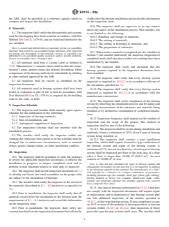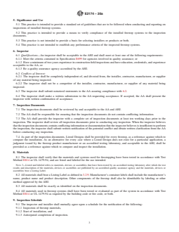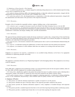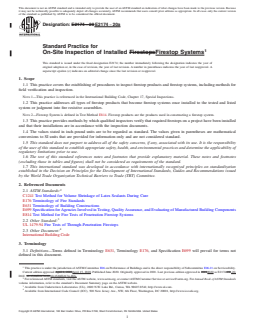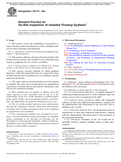 SIGNIFICANCE AND USE 5.1 This practice is intended to provide a standard set of guidelines that are to be followed when conducting and reporting on inspections of installed firestop systems. 5.2 This practice is intended to provide a means to verify compliance of the installed firestop systems to the inspection documents. 5.3 This practice is not intended to provide a basis for selecting installers or products or both. 5.4 This practice is not intended to establish any performance criteria of the inspected firestop systems. SCOPE 1.1 This practice covers the establishing of procedures to inspect firestop products and firestop systems, including methods for field verification and inspection. Note 1: This practice is referenced in the International Building Code, Chapter 17, Special Inspections. 1.2 This practice addresses all types of firestop products that become firestop systems once installed to the tested and listed system or judgment into fire resistive assemblies. Note 2: Firestop System is defined in Test Method E814. Firestop products are the products used in constructing a firestop system. 1.3 This practice provides methods by which qualified inspectors verify that required firestops on a project have been installed and that their installations are in accordance with the inspection documents. 1.4 The values stated in inch-pound units are to be regarded as standard. The values given in parentheses are mathematical conversions to SI units that are provided for information only and are not considered standard. 1.5 This standard does not purport to address all of the safety concerns, if any, associated with its use. It is the responsibility of the user of this standard to establish appropriate safety, health, and environmental practices and determine the applicability of regulatory limitations prior to use. 1.6 The text of this standard references notes and footnotes that provide explanatory material. These notes and footnotes (excluding those in tables and figures) shall not be considered as requirements of the standard. 1.7 This international standard was developed in accordance with internationally recognized principles on standardization established in the Decision on Principles for the Development of International Standards, Guides and Recommendations issued by the World Trade Organization Technical Barriers to Trade (TBT) Committee.