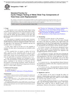 SIGNIFICANCE AND USE 4.1 This practice can be used to describe the effects of materials, manufacturing, and design variables on the fatigue performance of metallic tibial trays subject to cyclic loading for relatively large numbers of cycles. 4.2 The loading of tibial tray designs in vivo will, in general, differ from the loading defined in this practice. The results obtained here cannot be used to directly predict in-vivo performance. However, this practice is designed to allow for comparisons between the fatigue performance of different metallic tibial tray designs, when tested under similar conditions. 4.3 In order for fatigue data on tibial trays to be comparable, reproducible, and capable of being correlated among laboratories, it is essential that uniform procedures be established. SCOPE 1.1 This practice covers a procedure for the fatigue testing of metallic tibial trays used in knee joint replacements using a cyclic, constant-amplitude force. It applies to tibial trays that cover both the medial and lateral plateaus of the tibia. This practice may require modifications to accommodate other tibial tray designs. 1.2 This practice is intended to provide useful, consistent, and reproducible information about the fatigue performance of metallic tibial trays with one unsupported condyle. The results are applicable to the laboratory test conditions and may not correlate with in vivo performance. 1.3 The values stated in SI units are to be regarded as standard. No other units of measurement are included in this standard. 1.4 This standard does not purport to address all of the safety concerns, if any, associated with its use. It is the responsibility of the user of this standard to establish appropriate safety, health, and environmental practices and determine the applicability of regulatory limitations prior to use. 1.5 This international standard was developed in accordance with internationally recognized principles on standardization established in the Decision on Principles for the Development of International Standards, Guides and Recommendations issued by the World Trade Organization Technical Barriers to Trade (TBT) Committee.