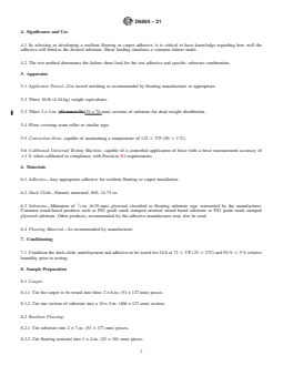 - Shear Strength Measurement: The standard outlines precise steps to measure the shear strength of adhesives when bonding resilient flooring or carpet to specific substrates, including specimen preparation, conditioning, and test execution.
