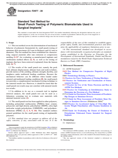 SIGNIFICANCE AND USE 4.1 Miniature specimen testing techniques are used to characterize the mechanical behavior of polymer stock materials and surgical implants after manufacture, sterilization, shelf aging, radiation crosslinking, thermal treatment, filler incorporation, and implantation (1-3). Furthermore, experimental materials can be evaluated after accelerated aging, fatigue testing, and hip, knee, or spine wear simulation. Consequently, the small punch test makes it possible to examine relationships between wear performance and mechanical behavior. This test method can also be used to rank the mechanical behavior relative to a reference control material. 4.2 Small punch testing results may vary with specimen preparation and with the speed and environment of testing. Consequently, where precise comparative results are desired, these factors must be carefully controlled. SCOPE 1.1 This test method covers the determination of mechanical behavior of polymeric biomaterials by small punch testing of miniature disk specimens (0.5 mm in thickness and 6.4 mm in diameter). The test method has been established for characterizing surgical materials after ram extrusion or compression molding (1-3)2; for evaluating as-manufactured implants and sterilization method effects (4, 5); as well as for testing of implants that have been retrieved (explanted) from the human body (6, 7). 1.2 The results of the small punch test, namely the peak load, ultimate displacement, ultimate load, and work to failure, provide metrics of the yielding, ultimate strength, ductility, and toughness under multiaxial loading conditions. Because the mechanical behavior can be different when loaded under uniaxial and multiaxial loading conditions (8), the small punch test provides a complementary mechanical testing technique to the uniaxial tensile test. However, it should be noted that the small punch test results may not correlate with uniaxial tensile test results. 1.3 In addition to its use as a research tool in implant retrieval analysis, the small punch test can be used as a laboratory screening test to evaluate new materials with minimal material waste (1). 1.4 The small punch test has been applied to other polymers, including polymethyl methacrylate (PMMA) bone cement, polyacetal, and high density polyethylene (HDPE), ultra high molecular weight polyethylene (UHMWPE), and polyetheretherketone (PEEK) (2, 3, 5, 9, 10). This standard outlines general guidelines for the small punch testing of implantable polymers. 1.5 This standard does not purport to address all of the safety concerns, if any, associated with its use. It is the responsibility of the user of this standard to establish appropriate safety, health, and environmental practices and determine the applicability of regulatory limitations prior to use. 1.6 This international standard was developed in accordance with internationally recognized principles on standardization established in the Decision on Principles for the Development of International Standards, Guides and Recommendations issued by the World Trade Organization Technical Barriers to Trade (TBT) Committee.