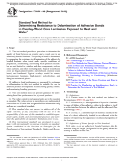 Adhering to ASTM D5824-98(2023) ensures that overlay-wood core laminates deliver reliable performance by verifying adhesive bond quality under realistic conditions. By quantifying resistance to delamination following exposure to water and heat, this test method supports manufacturers, product developers, and quality assurance teams in producing high-quality, durable, and compliant wood-based composite products. For anyone involved in the manufacture or testing of adhesively bonded wood overlays, familiarity with ASTM D5824 is essential for validating product performance and maintaining competitive standards in the marketplace.