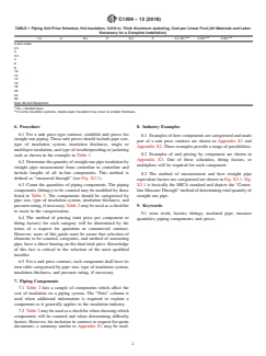 ASTM C1409-12(2018) is a guide published by ASTM International. Its full title is "Standard Guide for Measuring and Estimating Quantities of Insulated Piping and Components". This standard covers: SIGNIFICANCE AND USE 5.1 This guide establishes procedures to help parties involved in unit price piping insulation contracts reach agreement as to what components will be counted for pricing purposes. SCOPE 1.1 This guide defines the components of an insulated piping system to be measured or counted to determine quantities and pricing for unit price contracts or extra work. 1.2 Pricing may be done through unit pricing for each item by pipe size, type of insulation system, insulation thickness, double or multilayer insulation, type of weatherproofing or jacketing, and pressure rating (if necessary) or through component (fitting) factor or multipliers. 1.2.1 Component (fitting) factors or multipliers, which are multipliers times the straight length of piping as shown in Table 1, determine relative prices for each component not within the scope of this guide. These factors or multipliers are to be determined by the insulating contractor relative to the given situation and insulation system specification. 1.2.2 It is suggested that only one type of pricing be used on a project. 1.2.3 The values stated in inch-pound units are to be regarded as the standard. 1.3 This international standard was developed in accordance with internationally recognized principles on standardization established in the Decision on Principles for the Development of International Standards, Guides and Recommendations issued by the World Trade Organization Technical Barriers to Trade (TBT) Committee.