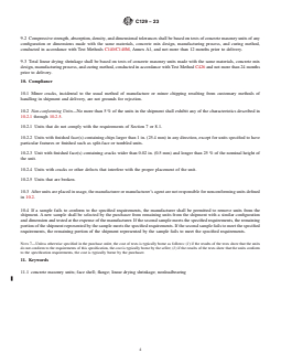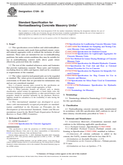 ASTM C129-23 is a technical specification published by ASTM International. Its full title is "Standard Specification for Nonloadbearing Concrete Masonry Units". This standard covers: ABSTRACT This specification covers hollow and solid nonloadbearing concrete masonry units made from Portland cement, water, and mineral aggregates with or without the inclusion of other materials. These units are intended for use in nonloadbearing partitions, but under certain conditions they may be suitable for use in nonloadbearing exterior walls above grade where effectively protected from the weather. Concrete masonry units manufactured under this specification shall conform to the specified density classifications and compressive strength requirements. SCOPE 1.1 This specification covers hollow and solid nonloadbearing concrete masonry units made from portland cement, water, and mineral aggregates with or without the inclusion of other materials. These units are intended for use in nonloadbearing partitions, but under certain conditions they may be suitable for use in nonloadbearing exterior walls above grade where effectively protected from the weather. 1.2 The text of this standard references notes and footnotes that provide explanatory material. These notes and footnotes (excluding those in tables and figures) shall not be considered as requirements of the standard. 1.3 The values stated in inch-pound units are to be regarded as standard. The values given in parentheses are mathematical conversions to SI units that are provided for information only and are not considered standard. Note 1: Concrete masonry units covered by this specification are made from lightweight or normal weight aggregates, or both. Note 2: When particular features are desired, such as density classification, surface texture for appearance or bond, finish, color, fire resistance, insulation, acoustical properties, or other special features, such properties should be specified separately by the purchaser. However, suppliers should be consulted as to the availability of units having the desired features. 1.4 This international standard was developed in accordance with internationally recognized principles on standardization established in the Decision on Principles for the Development of International Standards, Guides and Recommendations issued by the World Trade Organization Technical Barriers to Trade (TBT) Committee.