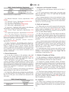 ABSTRACT This specification covers hollow and solid nonloadbearing concrete masonry units made from Portland cement, water, and mineral aggregates with or without the inclusion of other materials. These units are intended for use in nonloadbearing partitions, but under certain conditions they may be suitable for use in nonloadbearing exterior walls above grade where effectively protected from the weather. Concrete masonry units manufactured under this specification shall conform to the specified density classifications and compressive strength requirements. SCOPE 1.1 This specification covers hollow and solid nonloadbearing concrete masonry units made from portland cement, water, and mineral aggregates with or without the inclusion of other materials. These units are intended for use in nonloadbearing partitions, but under certain conditions they may be suitable for use in nonloadbearing exterior walls above grade where effectively protected from the weather. 1.2 The text of this standard references notes and footnotes that provide explanatory material. These notes and footnotes (excluding those in tables and figures) shall not be considered as requirements of the standard. 1.3 The values stated in inch-pound units are to be regarded as standard. The values given in parentheses are mathematical conversions to SI units that are provided for information only and are not considered standard. Note 1: Concrete masonry units covered by this specification are made from lightweight or normal weight aggregates, or both. Note 2: When particular features are desired, such as density classification, surface texture for appearance or bond, finish, color, fire resistance, insulation, acoustical properties, or other special features, such properties should be specified separately by the purchaser. However, suppliers should be consulted as to the availability of units having the desired features. 1.4 This international standard was developed in accordance with internationally recognized principles on standardization established in the Decision on Principles for the Development of International Standards, Guides and Recommendations issued by the World Trade Organization Technical Barriers to Trade (TBT) Committee.