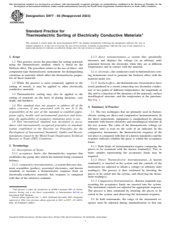 ASTM E977-05(2023) is a standard published by ASTM International. Its full title is "Standard Practice for Thermoelectric Sorting of Electrically Conductive Materials". This standard covers: ABSTRACT This practice covers the procedure for sorting electrically conductive materials using the thermoelectric method, which is based on the seebeck effect. The procedure relates to the use of direct- and comparator-type thermoelectric instruments for distinguishing variations in materials which affect the thermoelectric properties of those materials. The two techniques that are primarily used in thermoelectric sorting are direct and comparative instrumentation. In the direct instruments, equipment is standardized by placing materials with known chemistry and metallurgical structure in the test system. In the comparative instruments, the thermoelectric response of the test piece is compared with that of a known standard(s) and the response indicates whether the piece is within the acceptance limits. The electronic apparatus shall be capable of maintaining a sufficient temperature differential across the electrodes to produce a suitable thermoelectric voltage. The different procedures for sorting electrically conductive materials are presented in details. SCOPE 1.1 This practice covers the procedure for sorting materials using the thermoelectric method, which is based on the Seebeck effect. The procedure relates to the use of direct- and comparator-type thermoelectric instruments for distinguishing variations in materials which affect the thermoelectric properties of those materials. 1.2 While the practice is most commonly applied to the sorting of metals, it may be applied to other electrically conductive materials. 1.3 Thermoelectric sorting may also be applied to the sorting of materials on the basis of plating thickness, case depth, and hardness. 1.4 This standard does not purport to address all of the safety concerns, if any, associated with its use. It is the responsibility of the user of this standard to establish appropriate safety, health, and environmental practices and determine the applicability of regulatory limitations prior to use. 1.5 This international standard was developed in accordance with internationally recognized principles on standardization established in the Decision on Principles for the Development of International Standards, Guides and Recommendations issued by the World Trade Organization Technical Barriers to Trade (TBT) Committee.