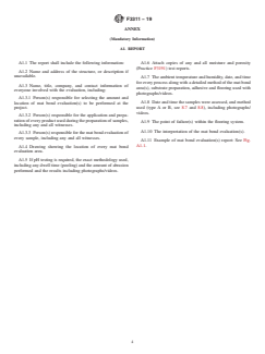 SIGNIFICANCE AND USE 5.1 Any individual performing a mat bond evaluation should either be a qualified installer or a trained and experienced evaluator of resilient flooring and adhesive bond strength. 5.2 This practice should not be considered mandatory, except when required or specified by the end user, general contractor and architect, flooring contractor, adhesive manufacturer(s), underlayment manufacturer(s) or flooring manufacturer(s). 5.2.1 Typically, this practice is only recommended or required if products from a different manufacturer(s) are being used in combinations not experienced before or if the substrate preparation or application method is in question. 5.3 The number of mat bond evaluation(s) should be selected that is appropriate for the project and be representative of each type of substrate, including trenches, grade, type of flooring, and ambient conditions. The number may also be determined by the responsible party or specified by the end user, general contractor and architect, flooring contractor, adhesive manufacturer(s), underlayment manufacturer(s) or flooring manufacturer(s). 5.4 All mat bond evaluation(s) conducted shall have the results recorded within report, including photographs (see A1.11). 5.5 There are many factors that may influence the outcome of mat bond evaluation(s). Therefore, it is required to follow each manufacturer(s) installation/application instructions for every product used including open, curing, drying time, and the length of time required prior to evaluation(s)s. 5.6 Each step of the process must be conducted only at a time when the subfloor and ambient conditions comply with the requirements defined by all of the relevant manufacturer(s) written installation instructions or Practices F710, F1482, F2419, F2471, F2678, F2873, F3010, or combinations thereof. SCOPE 1.1 This practice is designed to provide a short-term qualitative evaluation of the effectiveness and compatibility of the composite layers for flexible and fully adhered resilient flooring installation(s). Aspects of the resilient flooring assembly to be evaluated may include concrete surface profile (CSP), surface preparation, a topical moisture mitigation system, underlayment product(s), primer(s), application and the installation of the resilient flooring material itself. Aspects such as surface profile, surface cleanliness, surface porosity, the application method(s), and the open, curing, and drying times of each layer of the flooring system can be assessed using this practice prior to the actual full-scale installation taking place. 1.1.1 This practice is not intended for use with liquid applied, loose laid or perimeter fixed, or rigid resilient flooring products. 1.2 The values stated in inch-pound units are to be regarded as standard. The values given in parentheses are mathematical conversions to SI units that are provided for information only and are not considered standard. 1.3 This standard does not purport to address all of the safety concerns, if any, associated with its use. It is the responsibility of the user of this standard to establish appropriate safety, health, and environmental practices and determine the applicability of regulatory limitations prior to use. See Section 6 for specific Hazards statements. 1.4 This international standard was developed in accordance with internationally recognized principles on standardization established in the Decision on Principles for the Development of International Standards, Guides and Recommendations issued by the World Trade Organization Technical Barriers to Trade (TBT) Committee.