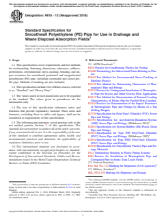 ASTM F810-12(2018) is a technical specification published by ASTM International. Its full title is "Standard Specification for Smoothwall Polyethylene (PE) Pipe for Use in Drainage and Waste Disposal Absorption Fields". This standard covers: ABSTRACT This specification covers smoothwall perforated and nonperforated polyethylene (PE) pipe for use in drainage and waste disposal absorption fields. It covers requirements and test methods for workmanship, flattening, dimensions, tolerances, stiffness, perforations, environmental stress cracking, bonding, and impact resistance. Materials for pipe shall be PE compounds which may consist of lubricants, stabilizers, nonpoly(ethylene) resin modifiers, and pigments. Marking, labeling, installation, and quality assurance shall conform to the requirements of this specification. SCOPE 1.1 This specification covers requirements and test methods for workmanship, flattening, dimensions, tolerances, stiffness, perforations, environmental stress cracking, bonding, and impact resistance for smoothwall perforated and nonperforated polyethylene (PE) pipe, including coextruded and closed profile pipe. Methods of marking are also included. 1.2 This specification includes two stiffness classes, referred to as, “Standard” and “Heavy Duty.” 1.3 The values stated in inch-pound units are to be regarded as the standard. The values given in parentheses are for information only. 1.4 The text of this specification references notes and footnotes that provide explanatory material. These notes and footnotes, excluding those in tables and figures, shall not be considered as requirements of this specification. 1.5 The following precautionary caveat pertains only to the test method portion, Section 7, of this specification: This standard does not purport to address all of the safety concerns, if any, associated with its use. It is the responsibility of the user of this standard to establish appropriate safety, health, and environmental practices and determine the applicability of regulatory limitations prior to use. 1.6 This international standard was developed in accordance with internationally recognized principles on standardization established in the Decision on Principles for the Development of International Standards, Guides and Recommendations issued by the World Trade Organization Technical Barriers to Trade (TBT) Committee.