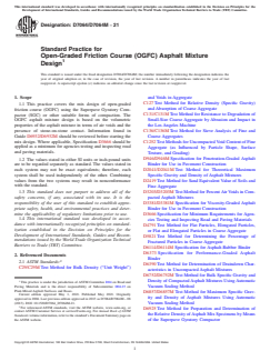 SIGNIFICANCE AND USE 5.1 The procedure described in this practice is used to design OGFC asphalt mixtures that will provide good performance in terms of permeability (tending to reduce hydroplaning and potential for skidding) and durability when subjected to high volumes of traffic. SCOPE 1.1 This practice covers the mix design of open-graded friction course (OGFC) using the Superpave Gyratory Compactor (SGC) or other suitable forms of compaction. The OGFC asphalt mixture design is based on the volumetric properties of the asphalt mixture in terms of air voids and the presence of stone-on-stone contact. Information found in Guide D6932/D6932M should be reviewed before starting the mix design. Where applicable, Specification D3666 should be applied as a minimum for agencies testing and inspecting road and paving materials. 1.2 The values stated in either SI units or inch-pound units are to be regarded separately as standard. The values stated in each system may not be exact equivalents; therefore, each system shall be used independently of the other. Combining values from the two systems may result in nonconformance with the standard. 1.3 This standard does not purport to address all of the safety concerns, if any, associated with its use. It is the responsibility of the user of this standard to establish appropriate safety, health, and environmental practices and determine the applicability of regulatory limitations prior to use. 1.4 This international standard was developed in accordance with internationally recognized principles on standardization established in the Decision on Principles for the Development of International Standards, Guides and Recommendations issued by the World Trade Organization Technical Barriers to Trade (TBT) Committee.