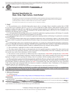 1.1 This specification covers cold-rolled, high-carbon strip in coils or cut lengths. Strip is classified as product that is 0.3000 in. [7.6 mm] or less in thickness and over 1/2 to 2315/16 in. [12.5 to 600 mm] in width, inclusive. Strip tolerance products may be available in widths wider than 2315/16 in. (600 mm) by agreement between purchaser and supplier; however, such products are technically classified as cold-rolled sheet. The maximum of the specified carbon range is over 0.25 to 1.35 %, inclusive. It is furnished in the following types as specified: