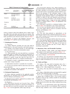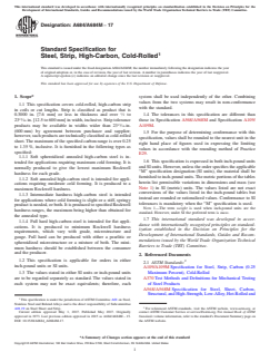 ABSTRACT This specification covers cold-rolled, high-carbon strip. The strip shall be furnished cold rolled spheroidized annealed, soft annealed, intermediate hardness, or full hard, as specified. The heat or cast analysis shall conform to that specified requirement. Hardness test and bend test shall be made to conform to the requirements specified. SCOPE 1.1 This specification covers cold-rolled, high-carbon strip in coils or cut lengths. Strip is classified as product that is 0.3000 in. [7.6 mm] or less in thickness and over 1/2 to 2315/16 in. [12.5 to 600 mm] in width, inclusive. Strip tolerance products may be available in widths wider than 2315/16 in. (600 mm) by agreement between purchaser and supplier; however, such products are technically classified as cold-rolled sheet. The maximum of the specified carbon range is over 0.25 to 1.35 %, inclusive. It is furnished in the following types as specified: 1.1.1 Soft spheroidized annealed high-carbon steel is intended for applications requiring maximum cold forming. It is normally produced to give the lowest maximum Rockwell hardness for each grade. 1.1.2 Soft annealed high-carbon steel is intended for applications requiring moderate cold forming. It is produced to a maximum Rockwell hardness. 1.1.3 Intermediate hardness high-carbon steel is intended for applications where cold forming is slight or a stiff, springy product is needed, or both. It is produced to specified Rockwell hardness ranges, the maximum being higher than obtained for the annealed type. 1.1.4 Full hard high-carbon steel is intended for flat applications. It is produced to minimum Rockwell hardness requirements, which vary with grade, microstructure and gauge. Full hard can be produced with either a pearlitic or spheroidized microstructure or a mixture of both. The minimum hardness should be established between the consumer and the producer. 1.2 This specification is applicable for orders in either inch-pound units or SI units. 1.3 The values stated in either SI units or inch-pound units are to be regarded separately as standard. The values stated in each system may not be exact equivalents; therefore, each system shall be used independently of the other. Combining values from the two systems may result in non-conformance with the standard. 1.4 The tolerances in this specification are different than those in Specification A568/A568M and Specification A109/A109M. 1.5 For the purpose of determining conformance with this specification, values shall be rounded to the nearest unit in the right hand place of figures used in expressing the limiting values in accordance with the rounding method of Practice E29. 1.6 This specification is expressed in both inch-pound units and SI units. However, unless the order specifies the applicable “M” specification designation (SI units), the material shall be furnished to inch-pound units. The metric portions of the tables herein list permissible variations in dimensions and mass (see Note 1) in SI (metric) units. The values listed are not exact conversions of the values listed in the inch-pound tables but instead are rounded or rationalized values. Conformance to SI tolerances is mandatory when the “M” specification is used. Note 1: The term weight is used when inch-pound units are the standard. However, under SI the preferred term is mass. 1.7 This international standard was developed in accordance with internationally recognized principles on standardization established in the Decision on Principles for the Development of International Standards, Guides and Recommendations issued by the World Trade Organization Technical Barriers to Trade (TBT) Committee.