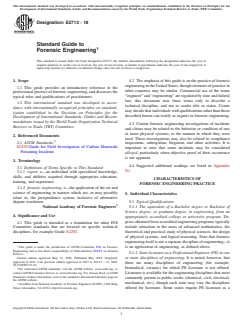 ASTM E2713-18 is a guide published by ASTM International. Its full title is "Standard Guide to Forensic Engineering". This standard covers: SIGNIFICANCE AND USE 4.1 This guide is intended as a foundation for other E58 Committee standards that are focused on specific technical disciplines, for example Guide E2292. 4.2 The emphasis of this guide is on the practice of forensic engineering in the United States, though elements of practice in other countries may be similar. Commercial use of the terms “engineer” and “engineering” are regulated by state and federal law; this document uses these terms only to describe a technical discipline, and not to confer title or status. Courts may decide that individuals with qualifications other than those described herein can testify as experts in forensic engineering. 4.3 Certain forensic engineering investigations of incidents and claims may be related to the behavior or condition of one or more physical systems, or the manner in which they were used. These investigations may also be related to compliance inspections, subrogation, litigation, and other activities. It is important to note that some incidents may be considered alleged, particularly when objective proof of their occurrence is not apparent. 4.4 Suggested additional readings are listed in Appendix X1. SCOPE 1.1 This guide provides an introductory reference to the professional practice of forensic engineering, and discusses the typical roles and qualifications of practitioners. 1.2 This international standard was developed in accordance with internationally recognized principles on standardization established in the Decision on Principles for the Development of International Standards, Guides and Recommendations issued by the World Trade Organization Technical Barriers to Trade (TBT) Committee.