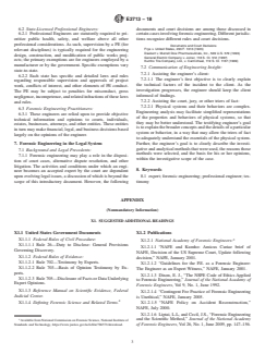 SIGNIFICANCE AND USE 4.1 This guide is intended as a foundation for other E58 Committee standards that are focused on specific technical disciplines, for example Guide E2292. 4.2 The emphasis of this guide is on the practice of forensic engineering in the United States, though elements of practice in other countries may be similar. Commercial use of the terms “engineer” and “engineering” are regulated by state and federal law; this document uses these terms only to describe a technical discipline, and not to confer title or status. Courts may decide that individuals with qualifications other than those described herein can testify as experts in forensic engineering. 4.3 Certain forensic engineering investigations of incidents and claims may be related to the behavior or condition of one or more physical systems, or the manner in which they were used. These investigations may also be related to compliance inspections, subrogation, litigation, and other activities. It is important to note that some incidents may be considered alleged, particularly when objective proof of their occurrence is not apparent. 4.4 Suggested additional readings are listed in Appendix X1. SCOPE 1.1 This guide provides an introductory reference to the professional practice of forensic engineering, and discusses the typical roles and qualifications of practitioners. 1.2 This international standard was developed in accordance with internationally recognized principles on standardization established in the Decision on Principles for the Development of International Standards, Guides and Recommendations issued by the World Trade Organization Technical Barriers to Trade (TBT) Committee.