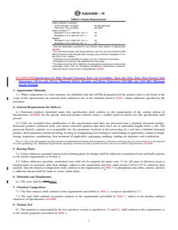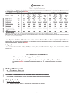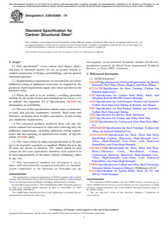 ABSTRACT This specification covers carbon structural steel shapes, plates, and bars of structural quality for use in riveted, bolted, or welded construction of bridges and buildings, and for general structural purposes. Heat analysis shall be used to determine the required chemical composition for carbon, manganese, phosphorus, sulfur, silicon, and copper. Tensile strength, yield strength, and elongation shall be evaluated using tension test and must conform to the required tensile properties. SCOPE 1.1 This specification2 covers carbon steel shapes, plates, and bars of structural quality for use in riveted, bolted, or welded construction of bridges and buildings, and for general structural purposes. 1.2 Supplementary requirements are provided for use where additional testing or additional restrictions are required by the purchaser. Such requirements apply only when specified in the purchase order. 1.3 When the steel is to be welded, a welding procedure suitable for the grade of steel and intended use or service is to be utilized. See Appendix X3 of Specification A6/A6M for information on weldability. 1.4 The text of this specification contains notes or footnotes, or both, that provide explanatory material. Such notes and footnotes, excluding those in tables and figures, do not contain any mandatory requirements. 1.5 For structural products produced from coil and furnished without heat treatment or with stress relieving only, the additional requirements, including additional testing requirements and the reporting of additional test results, of Specification A6/A6M apply. 1.6 The values stated in either inch-pound units or SI units are to be regarded separately as standard. Within the text, the SI units are shown in brackets. The values stated in each system are not exact equivalents; therefore, each system is to be used independently of the other, without combining values in any way. 1.7 This international standard was developed in accordance with internationally recognized principles on standardization established in the Decision on Principles for the Development of International Standards, Guides and Recommendations issued by the World Trade Organization Technical Barriers to Trade (TBT) Committee.